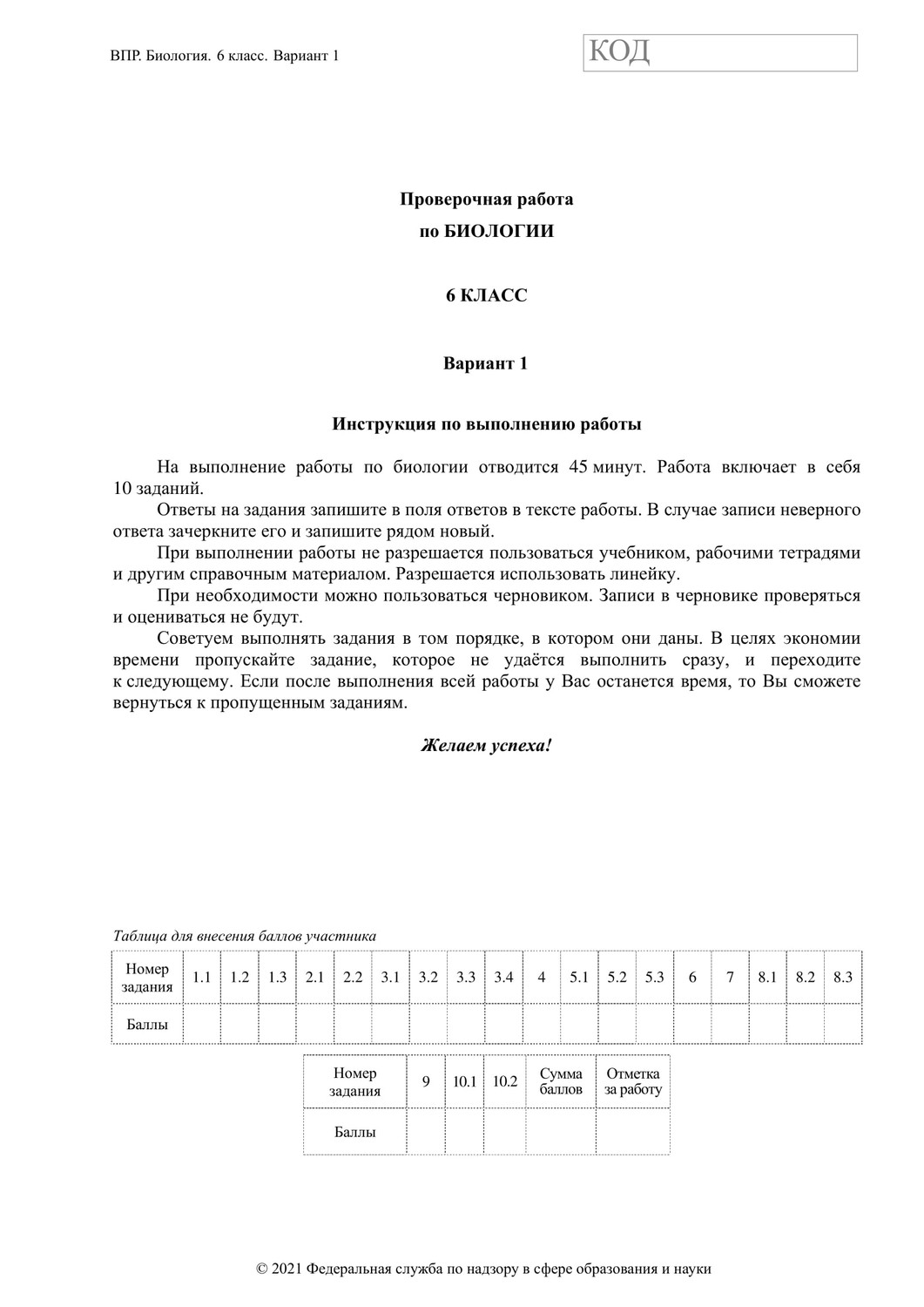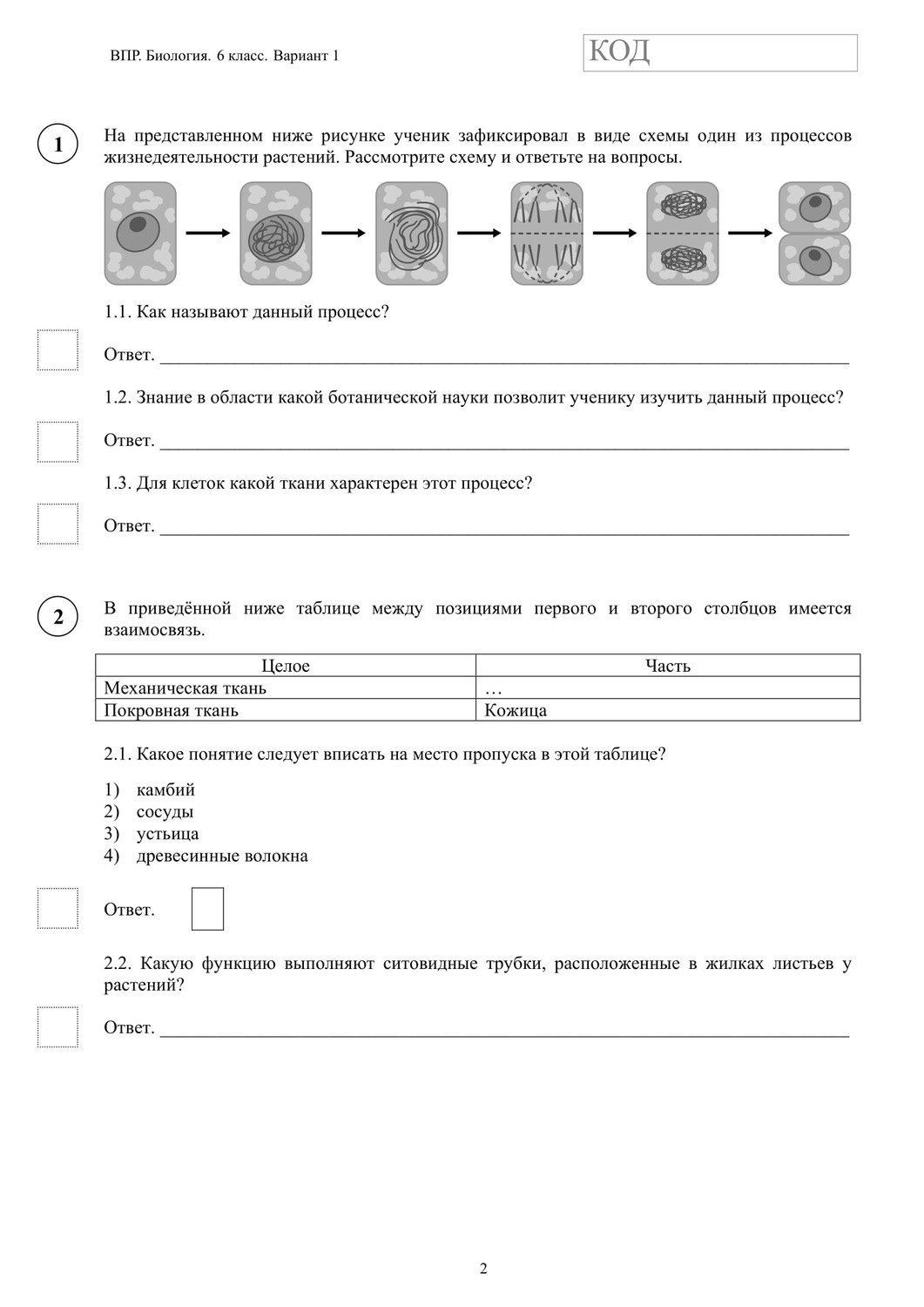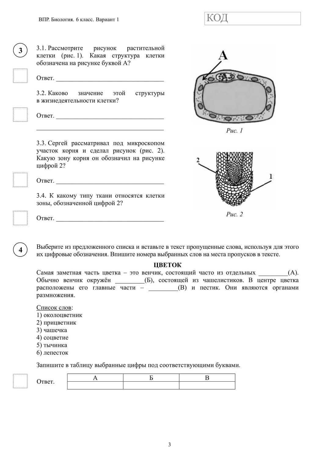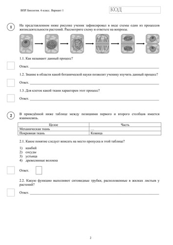 ВПР по биологии 6 класс. Вариант с ответами